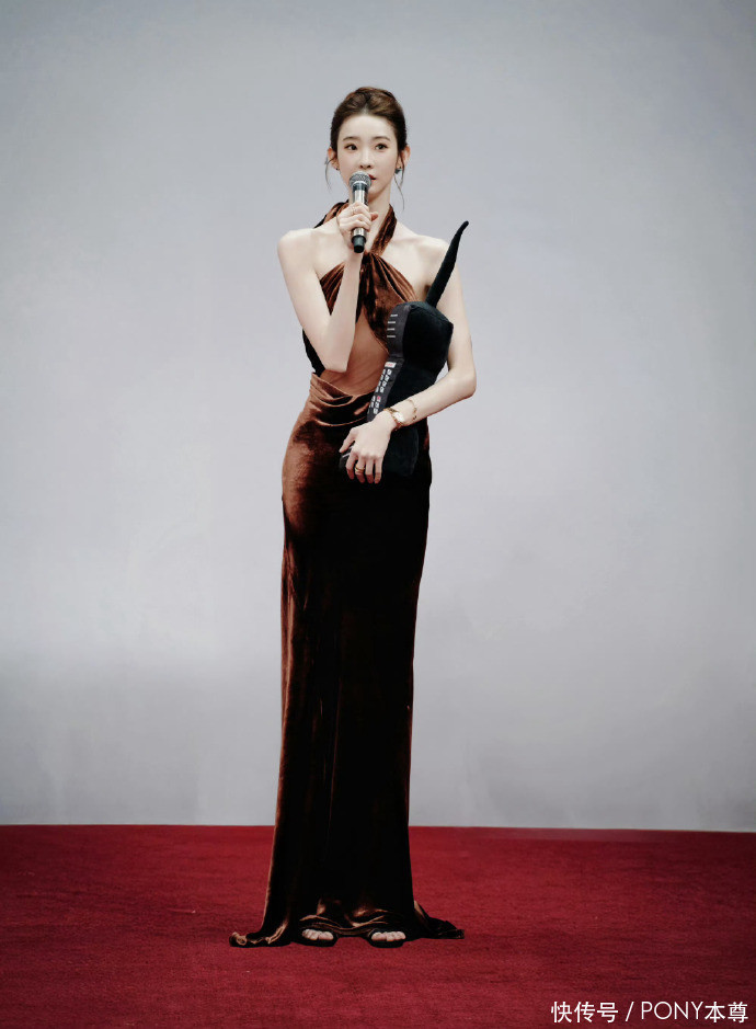 此次的咖啡色挂脖缎面裙造型,更是将她的身材优势与气质底蕴展现得淋漓尽致,176cm的高挑身形让长裙造型更具气场,成为妥妥的“行走的衣架子”。