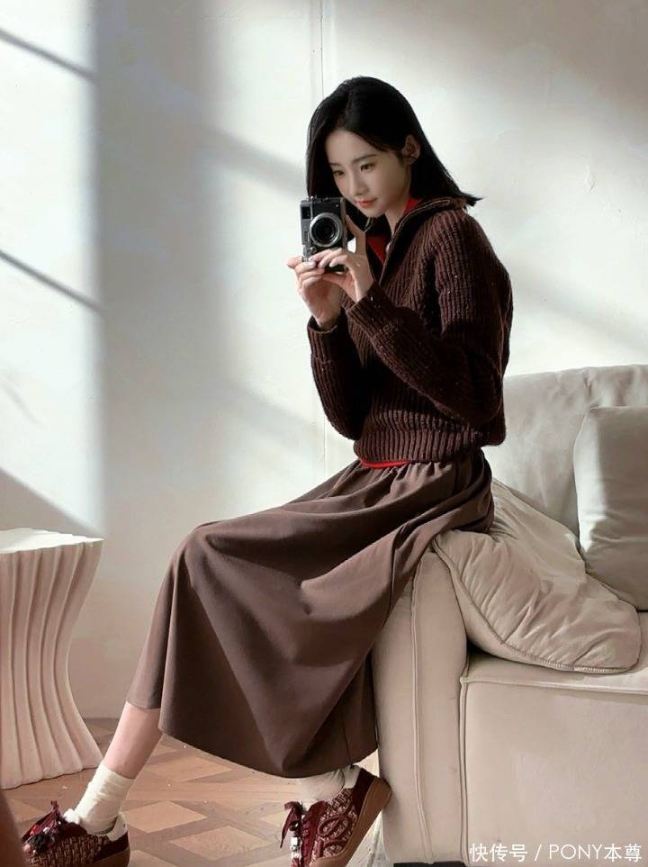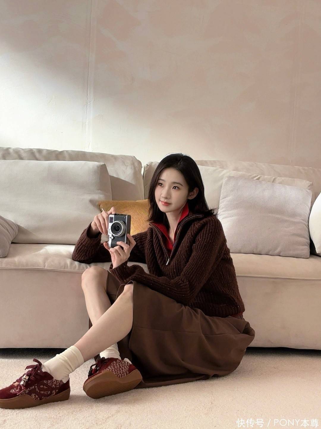 在私服穿搭中,她换了棕色针织POLO衫,混搭红色POLO衫,下半身搭配咖啡色半身裙,不同材质也能穿出高挑感!